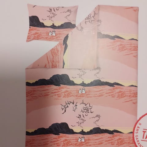 2 kpl Finlaysonin Muumi pussilakanasettejä, kuosilla "vaarallinen juhannus". Yhdessä paketissa pussilakana 150x210 cm ja tyynyliina 55x65 cm. Kaksipuolinen: sininen ja mustavalkoinen kuvio. Avaamattomat paketit. Yhden paketin hinta 40€, kaksi pakettia 75€.
