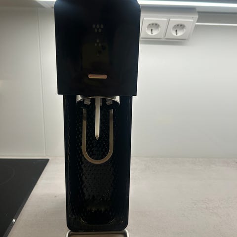 SodaStream hiilihapotuslaite kotikäyttöön. Väri musta. Laite on tarkoitettu veden ja muiden juomien hiilihapottamiseen vaihdettavien hiilidioksidipullojen avulla. Sopii keittiön työtasolle tai muulle tasaiselle alustalle. Kuvassa näkyy hiilidioksidipulloja, jotka liitetään laitteen taakse tai sisään mallista riippuen. Laite toimii käsikäyttöisesti painiketta painamalla, eikä vaadi sähköä.