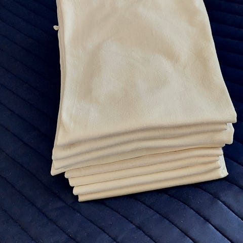 Kelta/valkoiset tyynyliinat 45cmx45cm. Ryppyiset säilytyksestä. Vetoketjukiinnitys.