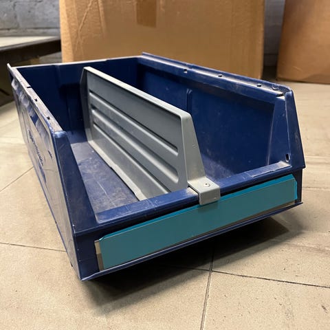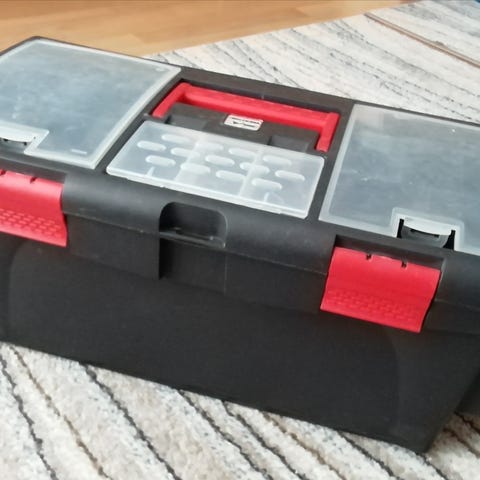 Muovinen säilytyslaatikko, jossa useita irrotettavia läpinäkyviä lokerorasioita. Päälaatikossa on keltainen runko ja kansi kantokahvalla. Lokerorasiat ovat läpinäkyvää muovia ja niissä on useita pieniä lokeroita pienten tavaroiden, kuten ruuvien, pulttien tai askartelutarvikkeiden säilytykseen. Sopii pienten osien järjestämiseen ja kuljettamiseen.