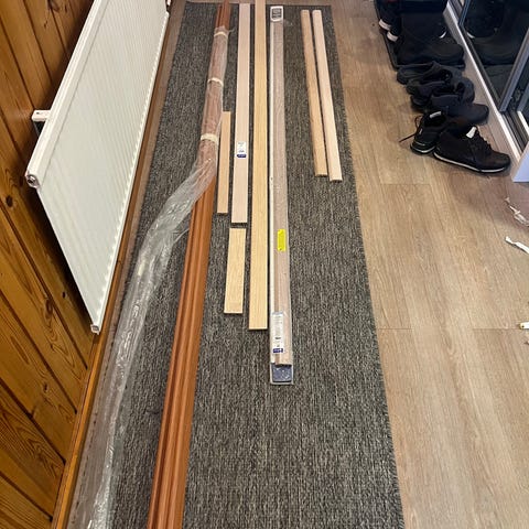 Valkoiset puupaneelit sisäkäyttöön. Paneelit soveltuvat esimerkiksi seinä- tai kattopaneeliksi. Materiaalina puu, pintakäsittelynä valkoinen maali tai kuultokäsittely. Useita kappaleita, pituudet vaihtelevat. Sopivat remontti- ja viimeistelytöihin sisätiloissa.