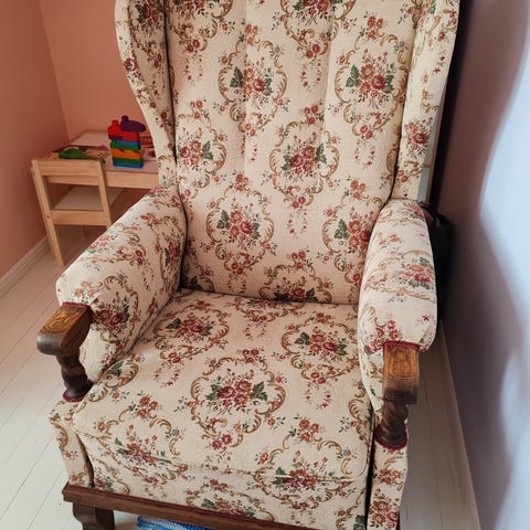 Muhkea nojatuoli .Kukkakuvio.Värinä beesi.