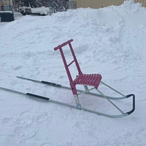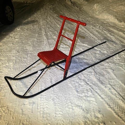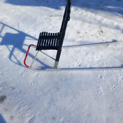 Sininen metallirunkoinen potkukelkka talvikäyttöön. Kelkassa on metalliset jalakset, istuinlaudat sekä ohjaustanko, jossa on puiset käsikahvat.