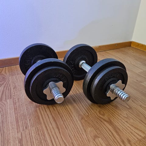 Crivit 10 kg käsipainosetti. Settiin kuuluu kuvanmukaiset varusteet. Säädettävä.