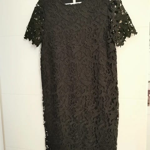 Kiva, lämpimän ruskea pitsimäistä materiaalia oleva mekko. Napitus alas asti. Hieman vajaamittaiset hihat. Tuoksuton. Kulkeutuu esim Ideaparkiin ja jollain aikavälillä myös Treelle.