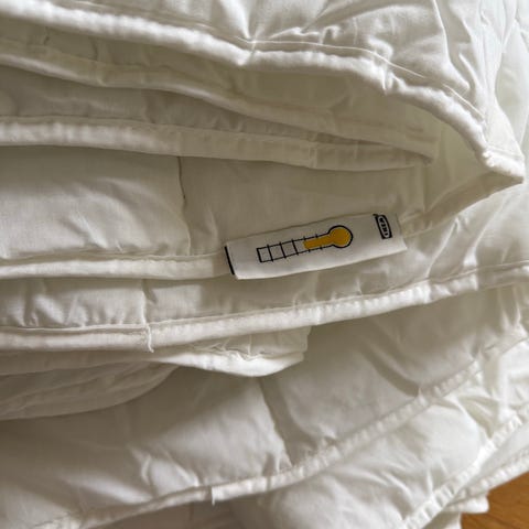 Vanha synteettikuitutäytteinen peitto, puhdas ja hajuton, upcycling-projektiin tai esimerkiksi pohjaksi patchwork-peittoon.