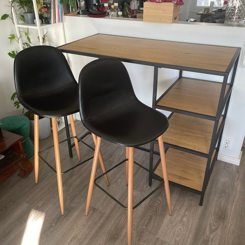 Myynnissä ruokailuryhmä, jossa baaripöytä ja kaksi baarijakkaraa. Ovh 290€. Pöytä on erinomaisessa kunnossa, mutta jalassa on hieman naarmuja. Tuolit erinomaisessa kunnossa.