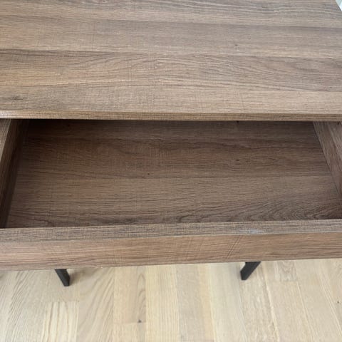 Työpöytä/ koulu pöytä. Toisen sivun takaosasta leikattu pala pois. Jos pöytä laitetaan seinän vasteen vasemmalla kyljellä, mitään ei huomaa. Katso viimeinen kuva.