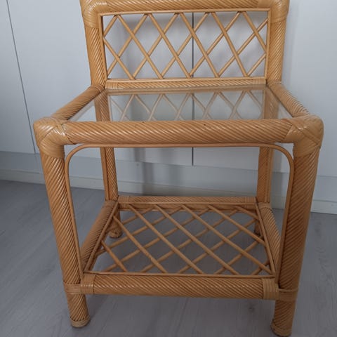 Pyöreä lasikantinen sivupöytä, jossa musta rottinkirunko. Pöydässä on kirkas, pyöreä lasitaso päällimmäisenä pienesti saanu osumaa näkyy viimeisessä kuvassa.Rottinkinen hyllyosa alatasolla pientä säilytystä tai esillepanoa varten. Sopii esimerkiksi olohuoneeseen, parvekkeelle tai oleskelutilaan lisä- tai sohvapöydäksi.Nouto.