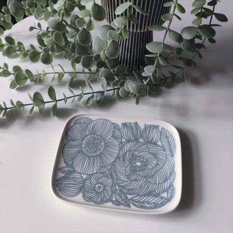 Ehjä ja kolhuton lautanen harmaalla kuviolla. Ollut kauhan alustana, joten ei ole ollut kovassa käytössä.