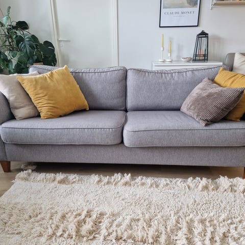 IKEA sohva harmaa kangasverhoilu. Kolmen istuttava malli, jossa irrotettavat istuin- ja selkätyynyt. Neutraalinsävyinen kangas sopii monenlaiseen sisustukseen. Soveltuu olohuoneeseen tai muuhun oleskelutilaan istuimeksi ja rentoutumiseen.