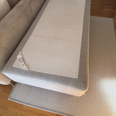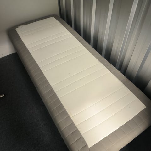 IKEA Sultan runkopatja, jossa vaalea kangaspäällinen ja puiset jalat. Patjan alla on puinen sälepohja, joka tukee patjaa. Soveltuu yhden hengen sängyksi tai varavuoteeksi.