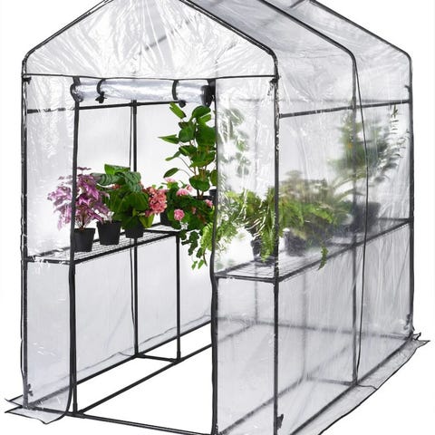 Kasvihuone varustettuna neljällä hyllyllä. Runko ja hyllyt on valmistettu pulverimaalatusta metallista ja muovista. Päällinen on valmistettu vahvasta PVC -muovista.
