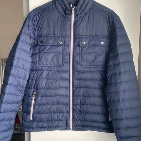 Tommy Hilfiger miesten takki, koko L. Väri tummansininen. Materiaalina untuva- ja höyhenvanutäyte, joka tuo kevyttä lämpöä. Takissa on vaakasuorat tikkaukset, vetoketjukiinnitys edessä sekä sivutaskut vetoketjuilla. Hihassa pieni Tommy Hilfiger -logomerkki. Soveltuu arkeen ja ulkoiluun viileämpiin säihin. Takki erittäin hyväkuntoinen, Kevyt mutta lämmin takki juuri näille keleille. Olka-helma 70cm, kainalo-kainalo 59, kainalo-hihansuu 52cm. Eläimetön koti.