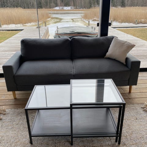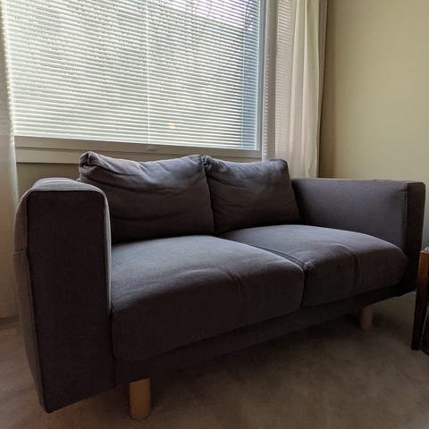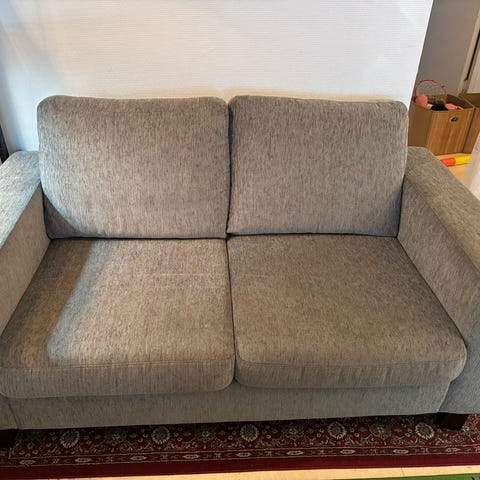 Harmaa 2-istuttava sohva kangasverhoilulla. Sohvassa on kaksi erillistä istuintyynyä ja kaksi selkätyynyä. Suorat käsinojat ja matala selkänoja tekevät mallista pelkistetyn. Sopii esimerkiksi olohuoneeseen tai pieneen tilaan lisäistuimeksi. Materiaalina on vaaleanharmaa kangasverhoilu ja jalat ovat piilossa kuvissa.