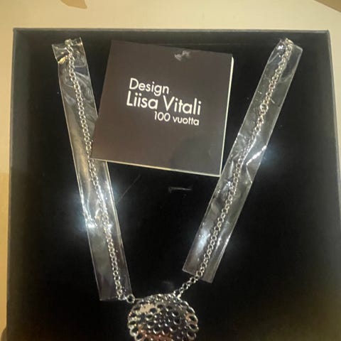 Liisa Vitali kaulakoru, 925 hopeaa. Ei ikinä käytetty, mutta säilytetty kauan, joten hyötyy varmaan kiillotuksesta.
