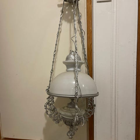 Vanha hieno öljylamppu. Kaikki osat paikallaan mutta ei ole moneen vuoteen käytetty sellaisenaan. Kuvassa saattaa näkyäkkin sähkölamppu mikä on pujotettu öljyvalaisimeen arkikäyttöä varten.
