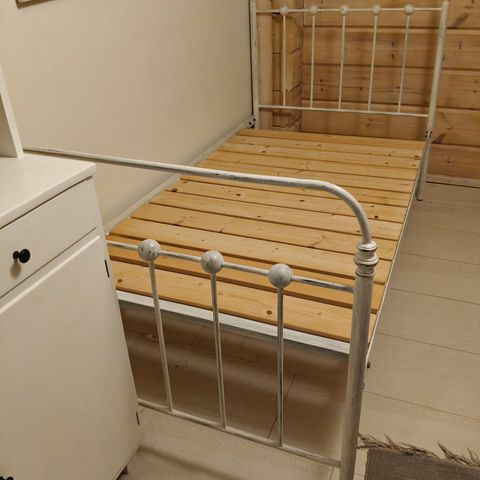 Hyväkuntoinen rautasänky tukevalla patjalla. Sänky ja patjat hyvässä kunnossa, ollut vieraskäytössä. Nyt purettuna, helposti koottavissa, kaikki osat tallessa. Sänky ja patjat säilytetään sisätiloissa.