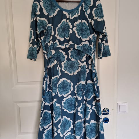 Mekon yläosa on hihaton, sivuissa on imetysaukot. Yläosan materiaali pehmeä tummansiniken trikoo, helma on kukkakuvioista viskoosia ja edessä keskellä on nappirivi.