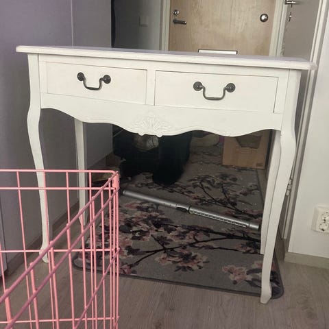 Valkoinen lipasto, 4 vetolaatikkoa. Pientä kulumaa pinnassa, näkyy viimeisessä kuvassa.