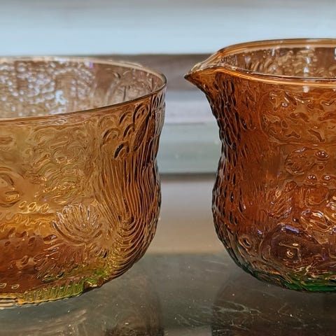 Nuutajärven valmistamat violetit neodyymilasiset sokerikko ja kermako.