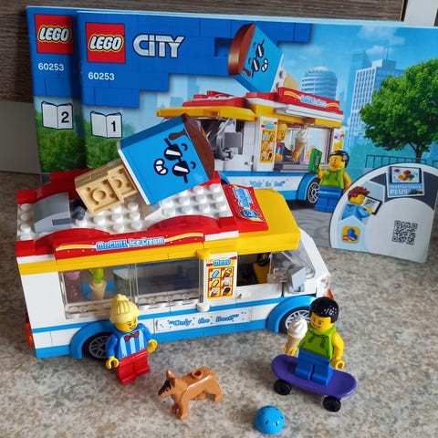 Myynnissä LEGO City 60253 jäätelöauto setti. Kaikki osat paitsi koira on tallessa. Ei ole alkuperäistä laatikkoa tai ohjeita.