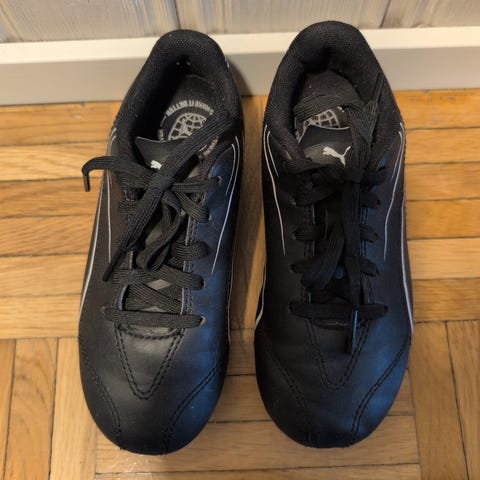 Puma jalkapallokengät, koko 31, väriltään valkoinen ja pinkki. Kengissä on piikkipohjat nurmikenttäkäyttöön. Mukana mustat säärisuojat, jotka kiinnittyvät jalkaan tarranauhalla.