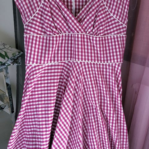 Hell Bunny mustavalkoinen, ruudullinen mekko. Materiaali on puuvillaa, sekä hieman elastaania, joka antaa kankaaseen joustoa. Mekossa selässä veroketju sekä hakanen. Pääntiellä solmittava satiininauha, helmaan on myös ommeltu satiininauha. Miehustassa kirjailtu kukka ja leppäkerttu. Sivusaumassa taskut.