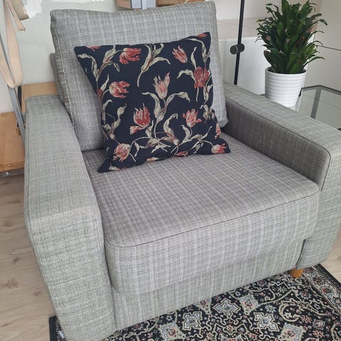 Muutettuamme pienempään asuntoon joudumme tilan puutteen vuoksi luopumaan tästä ihanasta Sitsin Alex-nojatuolista. Tuoli on ryhdikkään löhöilijän unelma.
