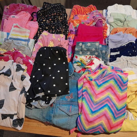 Kesäpaitoja 110cm 7kpl; 2 t-paitaa, 2 pidempää t-paitaa, 3 mekkoa. Pidettyjä, ehjiä, erimerkkisiä.