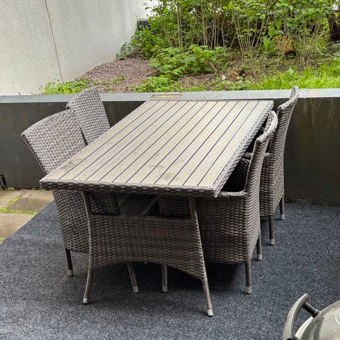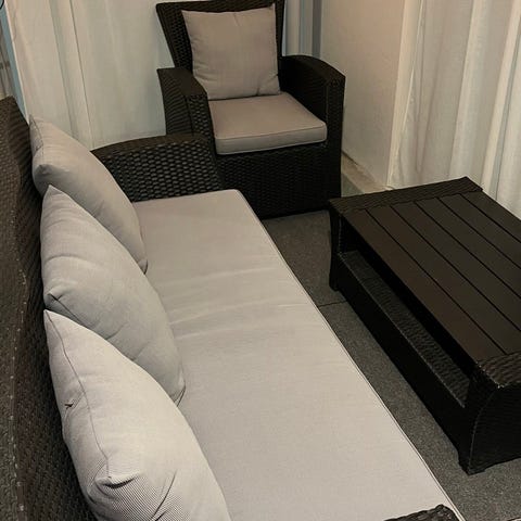 Polyrottinkinen terassisohvaryhmä, johon kuuluu kaksi nojatuolia ja suorakaiteen muotoinen matala pöytä lasikannella. Väri on musta. Materiaalina on säänkestävä polyrottinki metallirungolla. Sopii parvekkeelle, terassille tai pihalle oleskelu- ja kahvitteluryhmäksi.