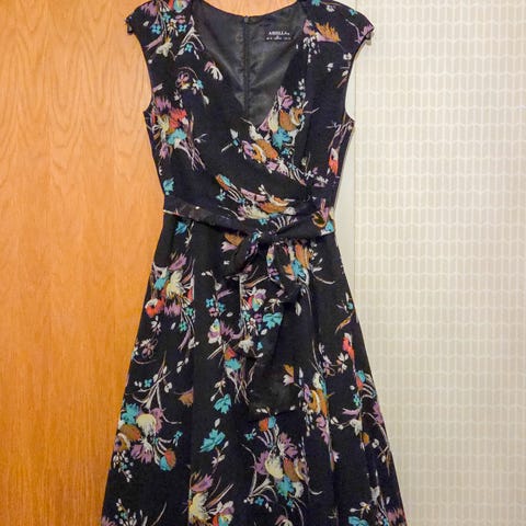 Ariella vuorellinen mekko kokoa UK16, noin 42, mielestäni pienempää mitoitusta, mitat alempana. Vyötärölle solmittava vyö (vyön pituus 105 cm, leveys 8,5 cm), selässä vetoketju. Yläosassa tukiluut, jotka pitävät mekon paikoillaan. Yläosassa paikat, joihin voi kiinnittää es. näkymättömät olkaimet. Kangas puuvillaa, sekä hieman elastaania. Vuoriosa polyesteriä, jonka takia ei jousta.