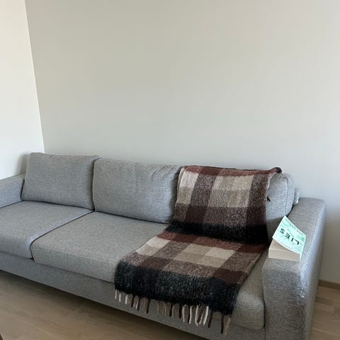 Vekestä muutama vuosi sitten ostettu sohva. Väriltään ruskea/oranssi. Oikeasta käsinojasta on irronnut nappi, mutta muuten sohva on hyvässä kunnossa. Nappi on tallessa ja joku minua taitavampi onnistuu sen kenties ompelemaan paikalleen.