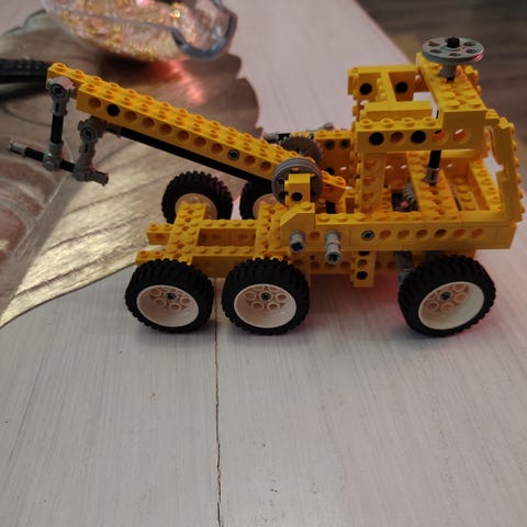 LEGO Technic kilpa-auto. Pienikokoinen rakennusmalli, jossa on neljä kumipyörää, ohjauspyörä, näkyvä moottorirakenne ja takaspoileri. Pääväreinä keltainen kori, punainen istuin ja mustat sekä harmaat tekniset osat. Sopii LEGO Technic -rakennelmiin ja varaosiksi tai osaksi isompia omia rakennusprojekteja. Kuski puuttuu.