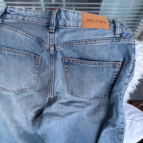 Monki naisten farkut, koko 32. Väri sininen denim. Materiaali puuvillaa. Perinteinen viisitaskuinen malli, nappi- ja vetoketjukiinnitys edessä. Takana kaksi paikkataskua ja vyötäröllä Monki-logomerkki. Sopivat arkipukeutumiseen ja yhdisteltäväksi erilaisten yläosien kanssa.