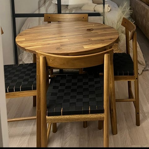 Pöydän nouto aikaisintaan 19.3., tuolit voi noutaa vaikka heti. Myydään vain settinä. Kuljetus mahdollinen n.15min automatkan päähän, +10e.