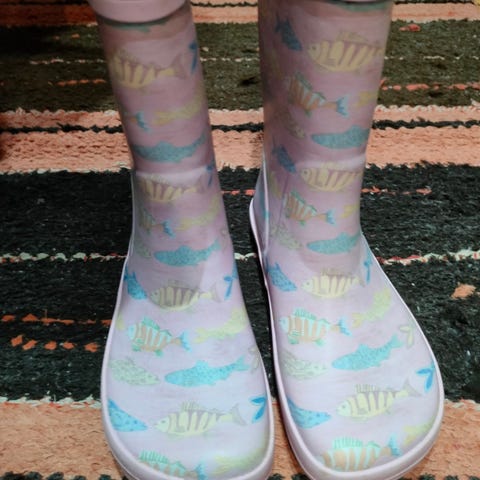 Viime syksynä uutena ostettu ja yhden lapsen käyttämät kumisaappaat joissa hauska kalakuosi.
