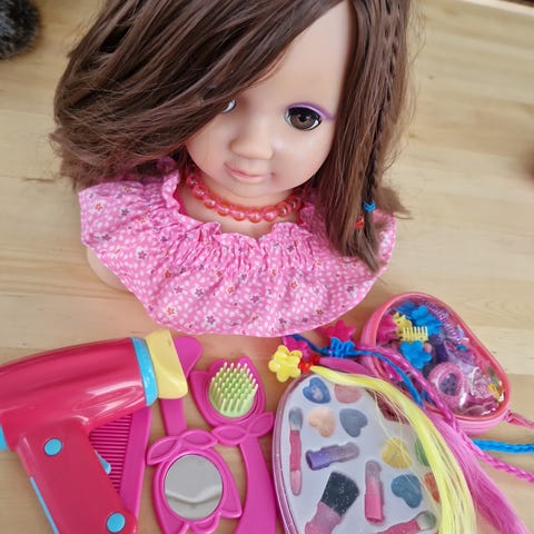 Pinkki setti kampaamoleikkeihin. Tästä lisätarvikkeita kampauspäälle. Sisältää mm. kiharrin, hiustenkuivain.