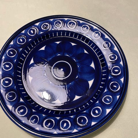 Arabia lautanen sininen koristekuvio. Lautasen etupuolella on tummansininen lasitus ja koristeellinen kuviointi. Sopii esimerkiksi kattaukseen tai koristekäyttöön. Takapuolella käsin merkitty teksti "Arabia Finland".