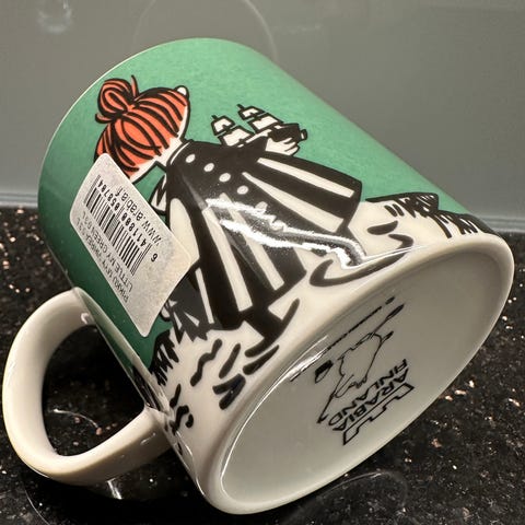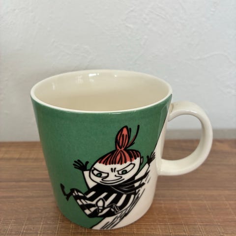 Arabia Muumimuki Pikku Myy liukumäessä (-00--07. Vihreäsävyinen posliinimuki, jossa Muumi-hahmoaiheinen kuvitus.