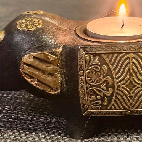 Esine on koristeltu perinteisin intialaisin kuvioin: kyljessä on pyhä Om-symboli ja päällä kaunis lootuksenkukka. Väri on tyylikäs musta, jossa kaiverrukset erottuvat vaaleina.