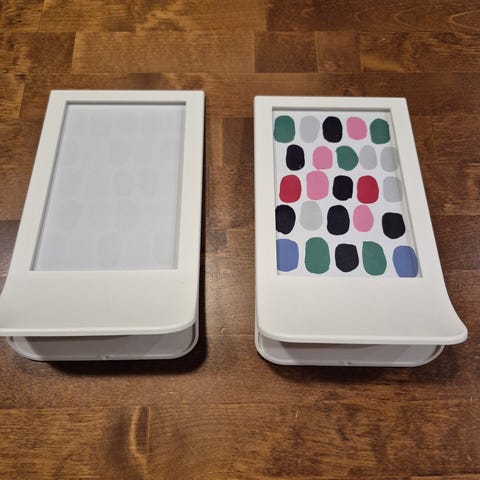 Valokuvakehys, koko 15 x 20 cm. Kehyksessä on puunvärinen reunus ja valkoinen paspispahvi. Kehys on tarkoitettu pöydälle asetettavaksi ja siinä on taakse taittuva tukijalka. Sopii esimerkiksi valokuville tai pienille julisteille, joiden koko on noin 15 x 20 cm.
