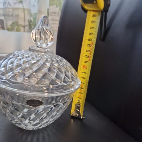 Kristallinen koristekulho, jossa on hiottu koristekuviointi ja aaltoileva reuna. Väri on kirkas.