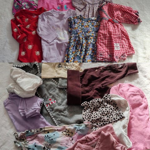 Vaatepaketti 56-62. Suurin osa kokoa 62. Vähätuoksuisesta ja lemmikittömästä taloudesta, pesty hajusteettomalla pesuaineella. Osa vaatteista täysin uusia ja vain käyttöönottopestyjä. Sininen kietaisubody on kulunut ja valkoisissa tassu-kuvioiduissa housuissa valoa vasten katsottaessa tahraa, sappisaippualla todennäköisesti lähtisi pois.