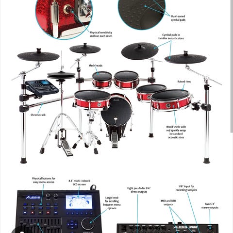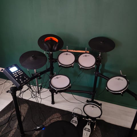 Useita vuosia vanha hyväkuntoinen sähkörumpusetti. Uutena hinta taisi olla tonnin luokkaa. Tähän hommattu pari peltiä lisää. Pedaalina Tama Iron cobra. Toisessa pikku tomissa kosketushäikkää, ei rekisteröi nopeita iskuja. Muuten täysin toimiva setti, jolla pärjää niin aloittelija kuin kokeneempikin rumpali.