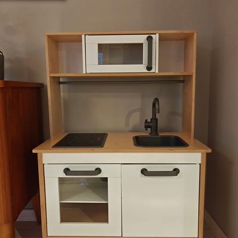 Ikean lasten leikkikeittiö. Siisti ja ehjä. Lieden toisesta ”levystä” patteri loppunut. Sekalainen setti tarvikkeita mukaan. Myynnissä myös muualla