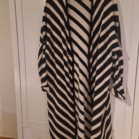 Papu mekko, koko XL/XXL. Väljä, pitkähihainen malli. Kuosina mustan ja vaalean vinoraidallinen. Materiaali 100 % puuvillaa. Kerran pidetty, kuin uusi.