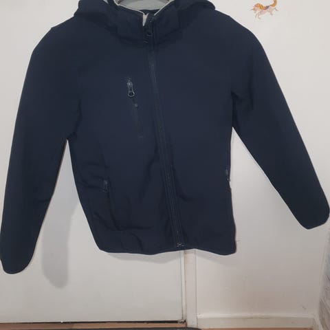 Musta trikootakki/-jakku, nätti pilkullinen vuorikangas jolla saa ilmettä esim hihansuihin. Nappikiinnitys ja napilliset etutaskut. Koko 134 (8-9 vuotta).
