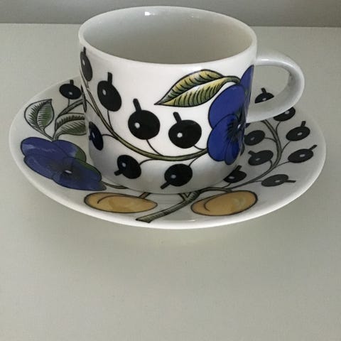 Kahvikuppi ja aluslautanen, Paratiisi, design Birger Kaipiainen, Arabia. Uutta vastaavassa kunnossa. Kupin tilavuus 2,8 dl, lautasen halkaisija 16,5 cm. Uunin, mikron ja astianpesukoneen kestävä. Myyn yhdessä. Nouto tai postitus.