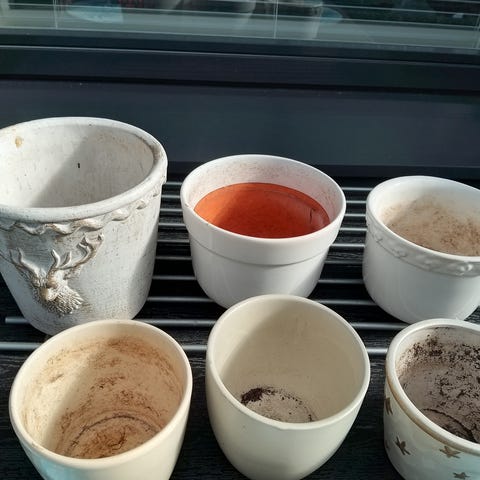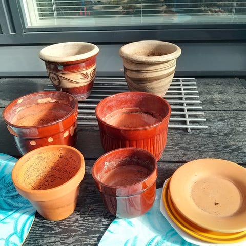 3 kpl: halkaisija 14 cm, reiät pohjassa + näille sopivat aluslautaset. 1 kpl: halkaisija 17 cm, reiät pohjassa. 1 kpl: halkaisija 14 cm, ei reikiä pohjassa.